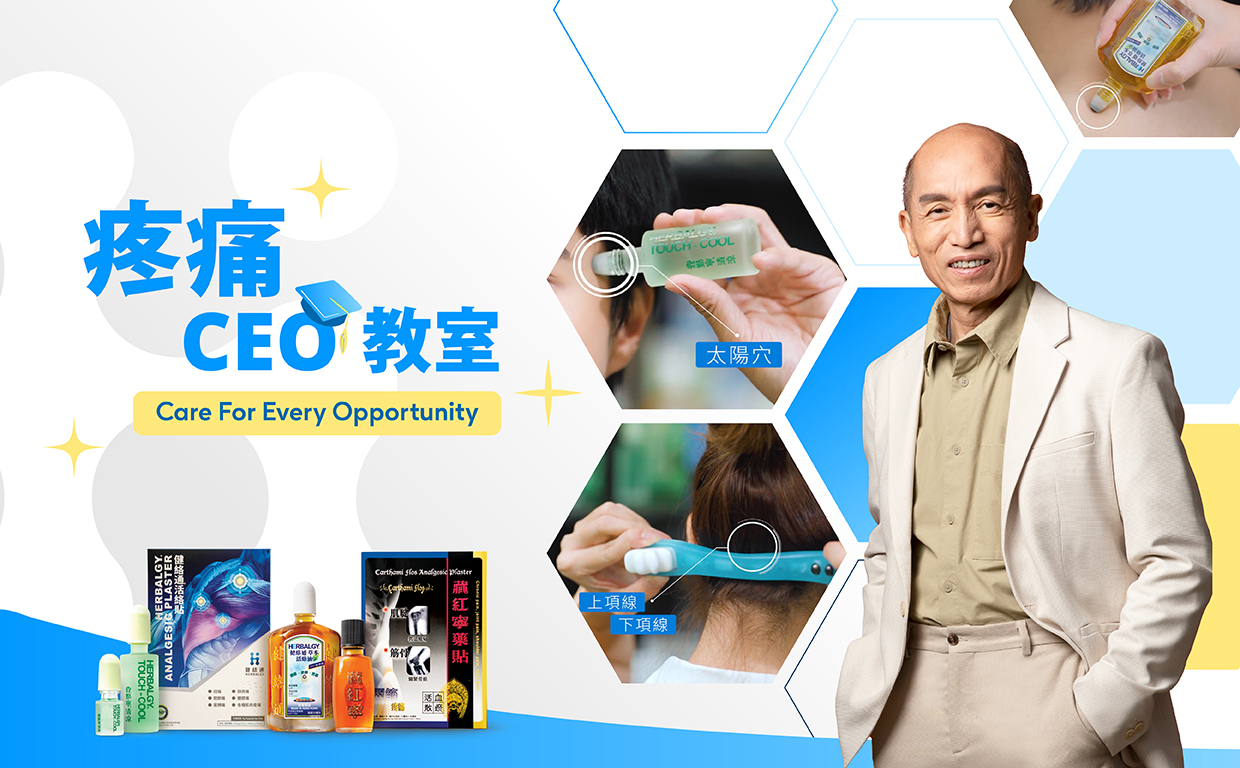 Care for Every Opportunity;痛楚,是⾝體讓我們⾃我關⼼的契機,疼痛CEO提醒你管理⾃⼰健康。疼痛管理ABC三步曲!可以按摩去改善項背部經絡氣⾎循⾏,緩解因為經絡阻滯引起的頭痛。